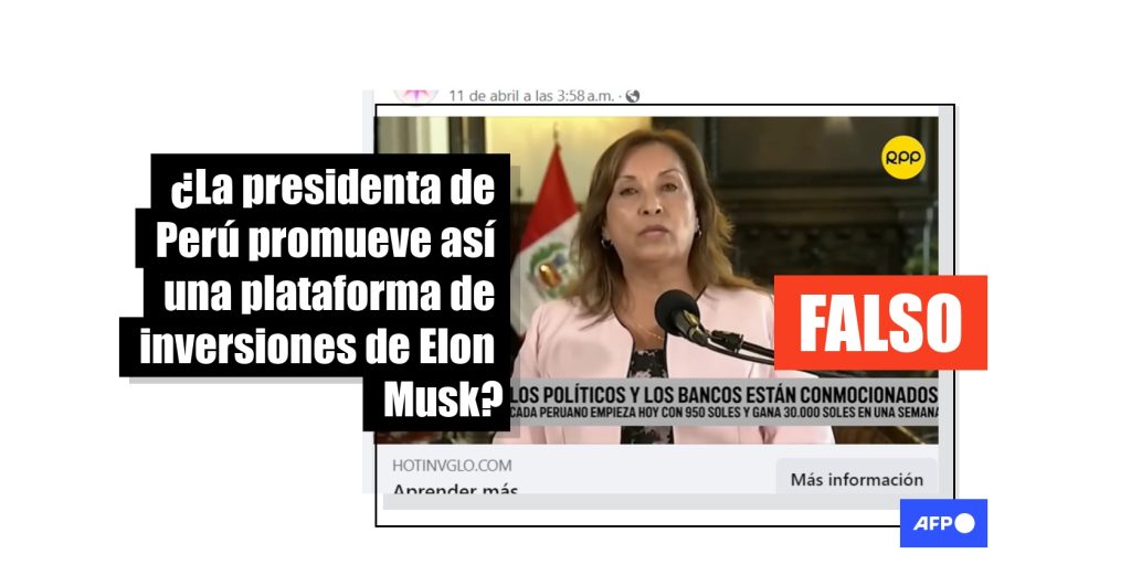 Luego se añade el fragmento de una conferencia de la presidenta peruana en el que brinda un supuesto descargo: “Puedo garantizar personalmente la fiabilidad de esta plataforma de inversión y dar las gracias a Elon Musk”.