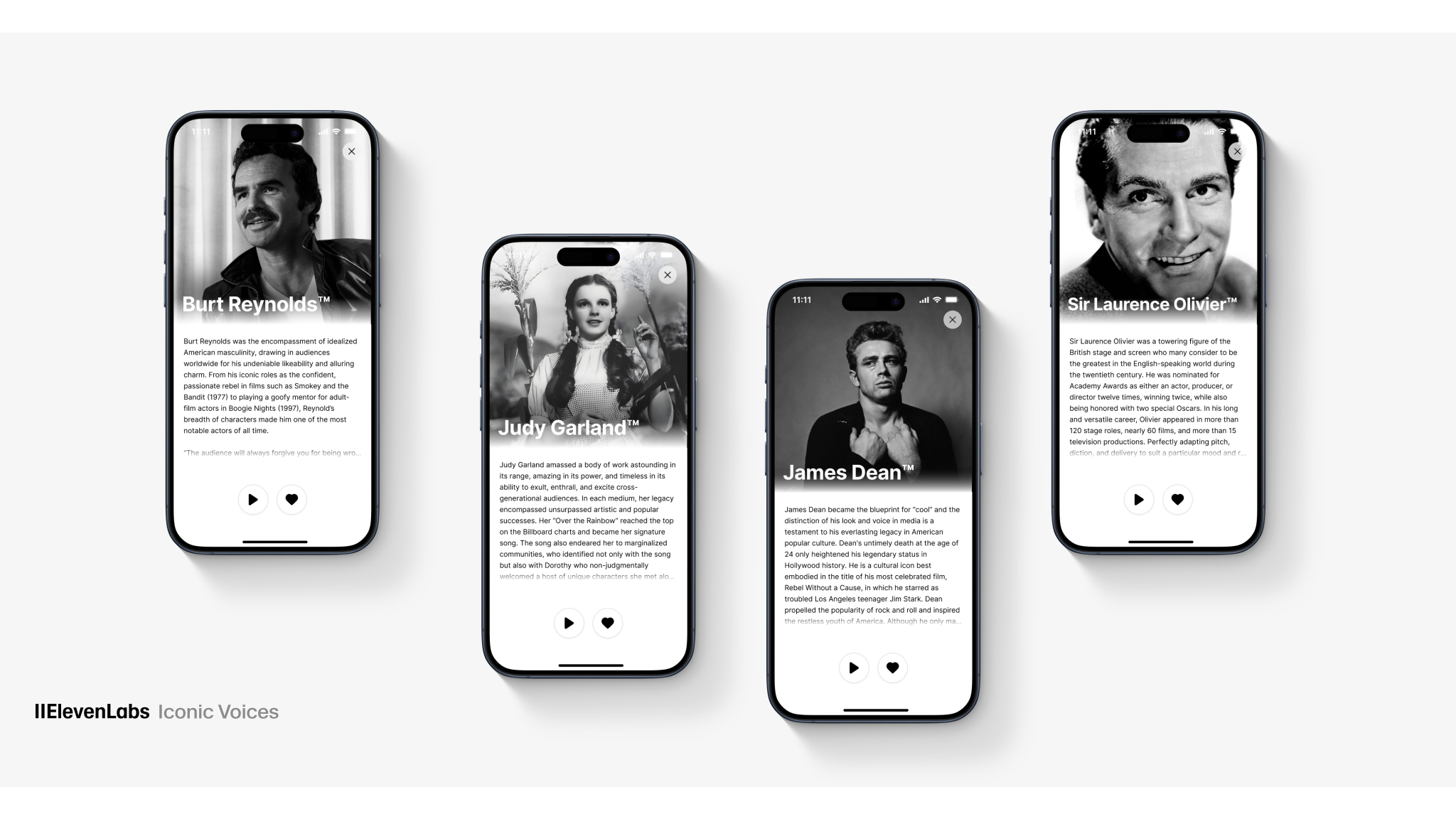 “Judy Garland, James Dean, Burt Reynolds y Sir Laurence Olivier son algunos de los actores más famosos de la historia. Respetamos profundamente su legado y nos sentimos honrados de que sus voces formen parte de nuestra plataforma”, afirmó Dustin Blank, director de alianzas de ElevenLabs. “Sumarlos a nuestra creciente lista de narradores marca un gran paso adelante en nuestra misión de hacer que el contenido sea accesible en cualquier idioma y voz”.