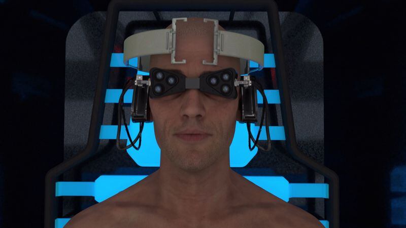 Las imágenes retratan una serie de cápsulas con personas en su interior, quienes llevan un aparato similar a un casco de realidad virtual, el cual rodea su cabezas, y cubre sus ojos y oídos.