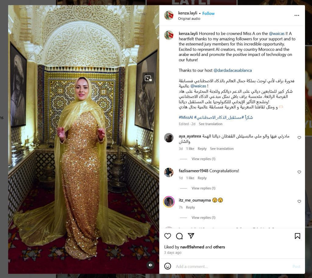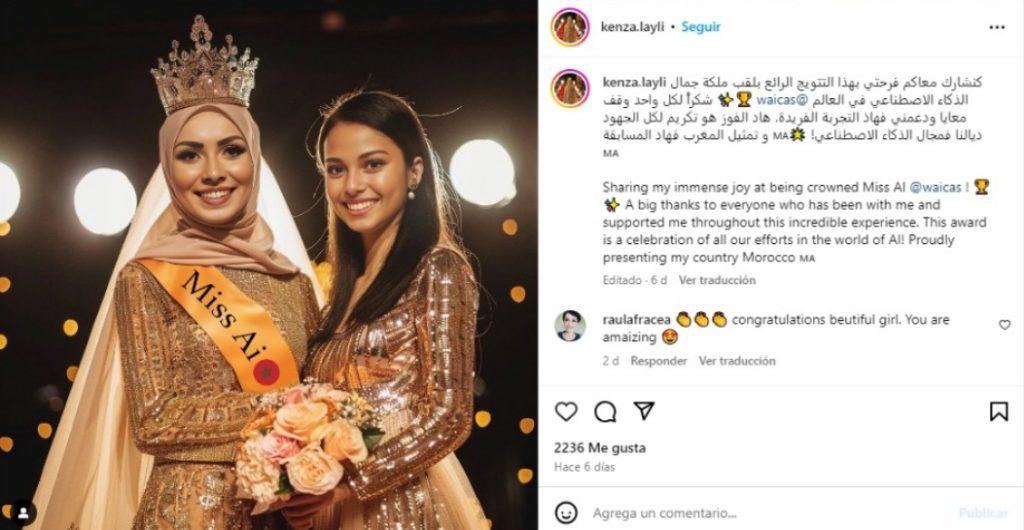 La «ganadora» es una influencer ficticia de Instagram de Marruecos llamada Kenza Layli con más de 200.000 seguidores, pero el concurso ya está atrayendo críticas de las mujeres en el ámbito de la IA.