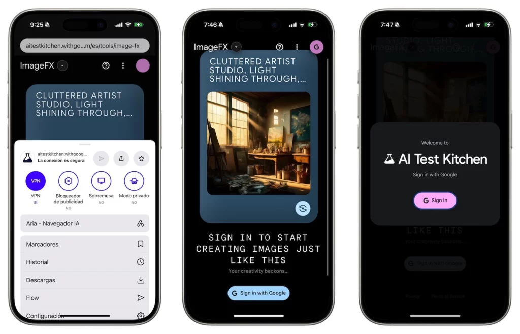 Si intentan probarlo con una cuenta de Google en cualquier navegador, se encontrarán con que no es posible si estás en España, donde no está disponible. La solución pasa por usar un navegador como Opera con su VPN activado (que en realidad es un proxy) y desde ahí acceder. En esta oportunidad lo hemos hecho con ImageFX y una cuenta personal.