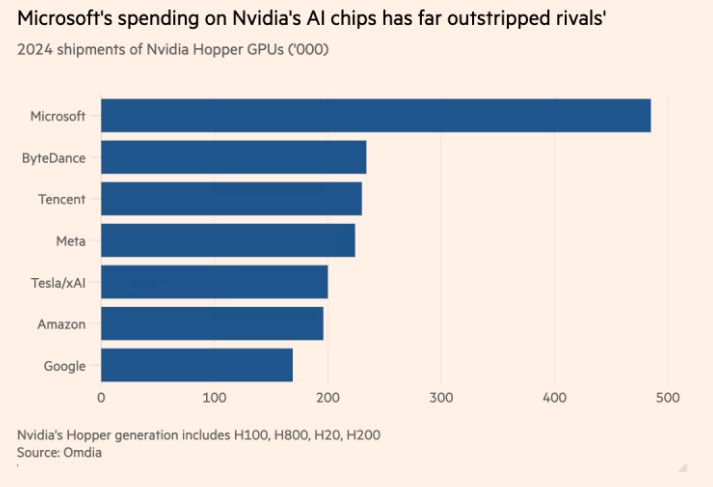 Los analistas de Omdia, una consultora tecnológica, calculan que Microsoft compró 485.000 chips «Hopper» de Nvidia este año. Esto sitúa a Microsoft muy por delante de Meta, el siguiente mayor cliente de Nvidia en EE.UU., que compró 224.000 chips Hopper, así como de sus rivales de computación en nube Amazon y Google.