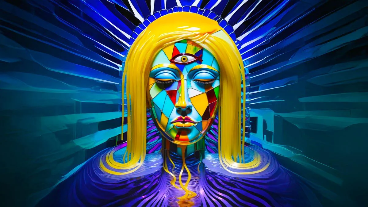 La imagen de la mujer tiene tres ojos, cabello parecido al de un espagueti y una rebanada de queso amarillo derretido goteando por su cabeza. Su cuerpo es un mosaico, con fragmentos de vidrio de colores primarios similares a los que se pueden ver en las antiguas ventanas de una iglesia.
