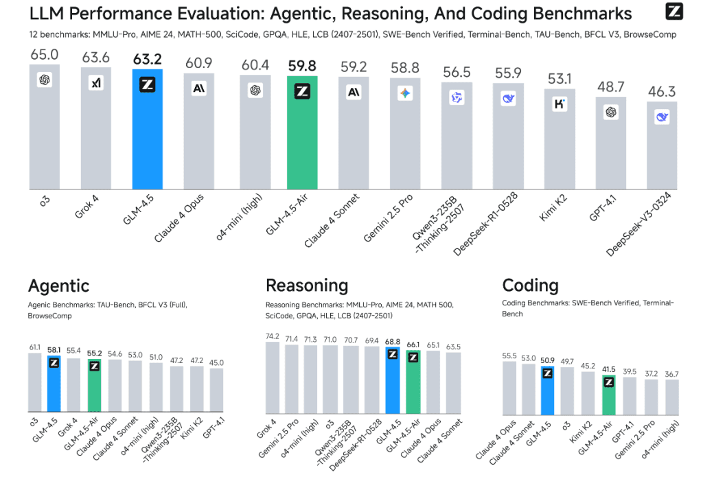 Z.ai no solo promete, sino que cumple: en evaluaciones independientes, GLM-4.5 ha logrado el tercer puesto mundial en 12 pruebas clave que miden pensamiento, programación y tareas de agente, por detrás solamente de GPT-4 y Grok 4.