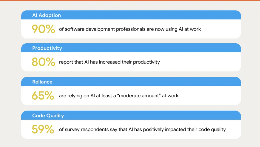 La inteligencia artificial dejó de ser una curiosidad en los equipos de ingeniería: según el informe State of AI-assisted Software Development del programa DORA de Google Cloud, la adopción de IA entre profesionales del software alcanzó el 90%, un avance de 14 puntos porcentuales respecto al año anterior. En la práctica, los encuestados informan una mediana de 2 horas diarias de trabajo asistido por IA, lo que marca un cambio estructural en la forma de construir software.