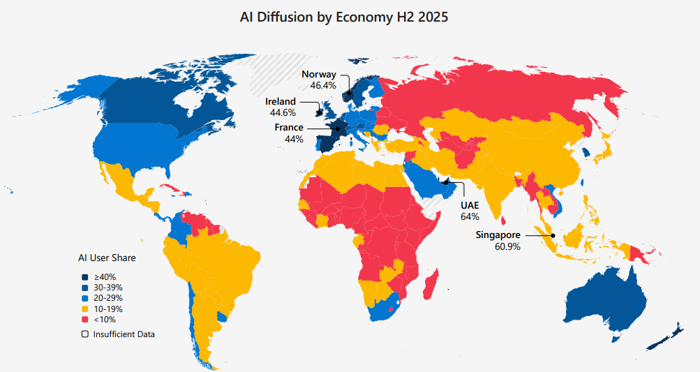 El dato implica que uno de cada seis habitantes del planeta ya interactúa de forma regular con tecnologías de IA generativa, como asistentes conversacionales, herramientas de creación de contenidos o sistemas de apoyo a tareas profesionales. Sin embargo, el informe también pone el foco en una realidad estructural: mientras la adopción crece, la brecha digital entre regiones se amplía.
